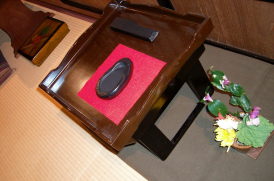 今回の展示はスタッフKさんの発案で、文机や銭箱、火鉢などを